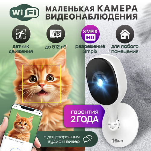 IP видеокамера c Wi-Fi домашняя DAHUA C3AP. 3 МП; 1/3.2” CMOS; объектив 2.8 мм.; механический ИК-фильтр; чувствительность 0.01лк@F2.0; сжатие: H.265; 2 потока до 3 Мп@25 к/с; обнаружение людей; ИК-подсветка 10 м.; встроенный микрофон и динамик; MicroSD до 256 ГБ; питание: 5В (DC); Wi-Fi 2.4 ГГц